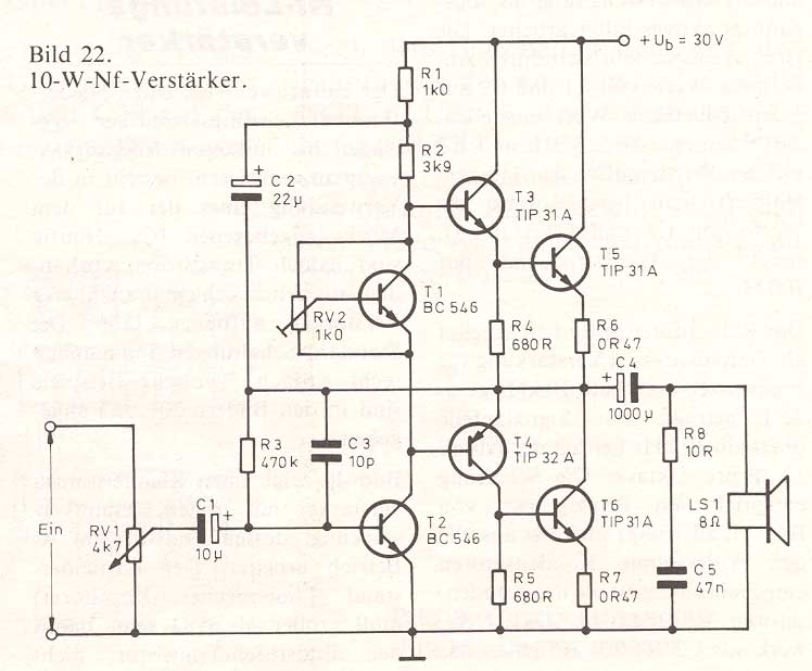 Ein einfach aufzubauender Bauvorschlag, der sich sehr gut als "Einsteigerendstufe" eignet. Zum Aufbau gibt es nicht viel zu sagen. T5 und T6 gehören natürlich an einen Kühlkörper. Der Rest sollte ohne auskommen. Als Lautsprecher dient ein 8-Ohm-Typ von dem es ja jede Menge gibt. Reizvoll wird die Geschichte, wenn diese Endstufe als Ausgangspunkt für eine kleine Aktivlösung genommen wird. Als Netzteil könnte man dann ein geregeltes 30 Volt (Labor-)Netzteil benutzen. R3 dient zur Arbeitspunkteinstellung von T1, welcher als einstellbare Z-Diode geschaltet ist. Zwischen R6 und T6 sollte die halbe Speisespannung liegen. Notfalls muß für R3 ein Poti eingebaut werden um den korrekten Abgleich zu gewährleisten. Mit RV2 kann man nun denn Ruhestrom der Endstufe einstellen. Dieser ist so hoch einzustellen, das gerade keine Verzerrungen mehr hörbar werden. Wer ein Oszi sein eigen nennt, speist ein 1kHz-Signal in die Endstufe und gleicht die Endstufe dann auf optimale Signalform ab. C3 bestimmt die obere Grenzfrequenz und trägt zu Stabilität der Endstufe entscheidend bei. C5/R8 verhindern wides Schwingen und sollten deshalb ohne andere Maßnahmen nicht weggelassen werden. R6 / R7 = 2 Watt-Typen. C4 = >35V schneller Elko. C1 = Tantal 35V(Perle).