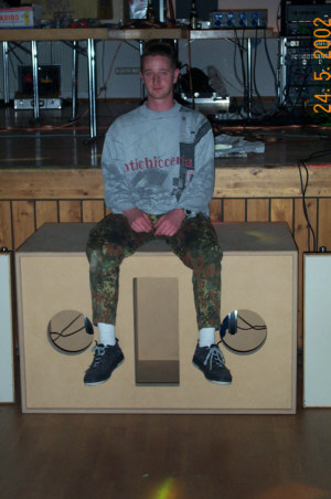 Das Gehäuse ist soweit in der Rohfassung fertig. Es wurde mit den Treibern (zwei 18 Zoll!) bestückt. Erste Messungen und Versuche zeigten eine sehr gute Performance. Gemessen wurde ein Free-Air-Wirkungsgrad von bis zu 110 dB.