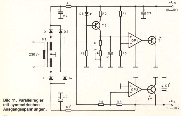 Dieses Netzteil eignet sich natürlich für alle Vorstufenschaltungen, Filter oder ähnlichen. Man kann z.B. diese Schaltung als 'Hauptregler' einsetzen und alle Halbleiter und OP´s noch zusätzlich mit weiteren Reglern gegeneinander entkoppeln. Dazu bieten sich einfache Z-Dioden an, denn diese sind ja die einfachsten Parallelregler. Natürlich kann man die hohe Güte dieser Regelung nutzen und alle OP´s eines Gerätes mit separaten Reglern ausstatten. Sie können versichert sein : Selbst die größten HIGH-END-Vorstufen sind da nicht besser.